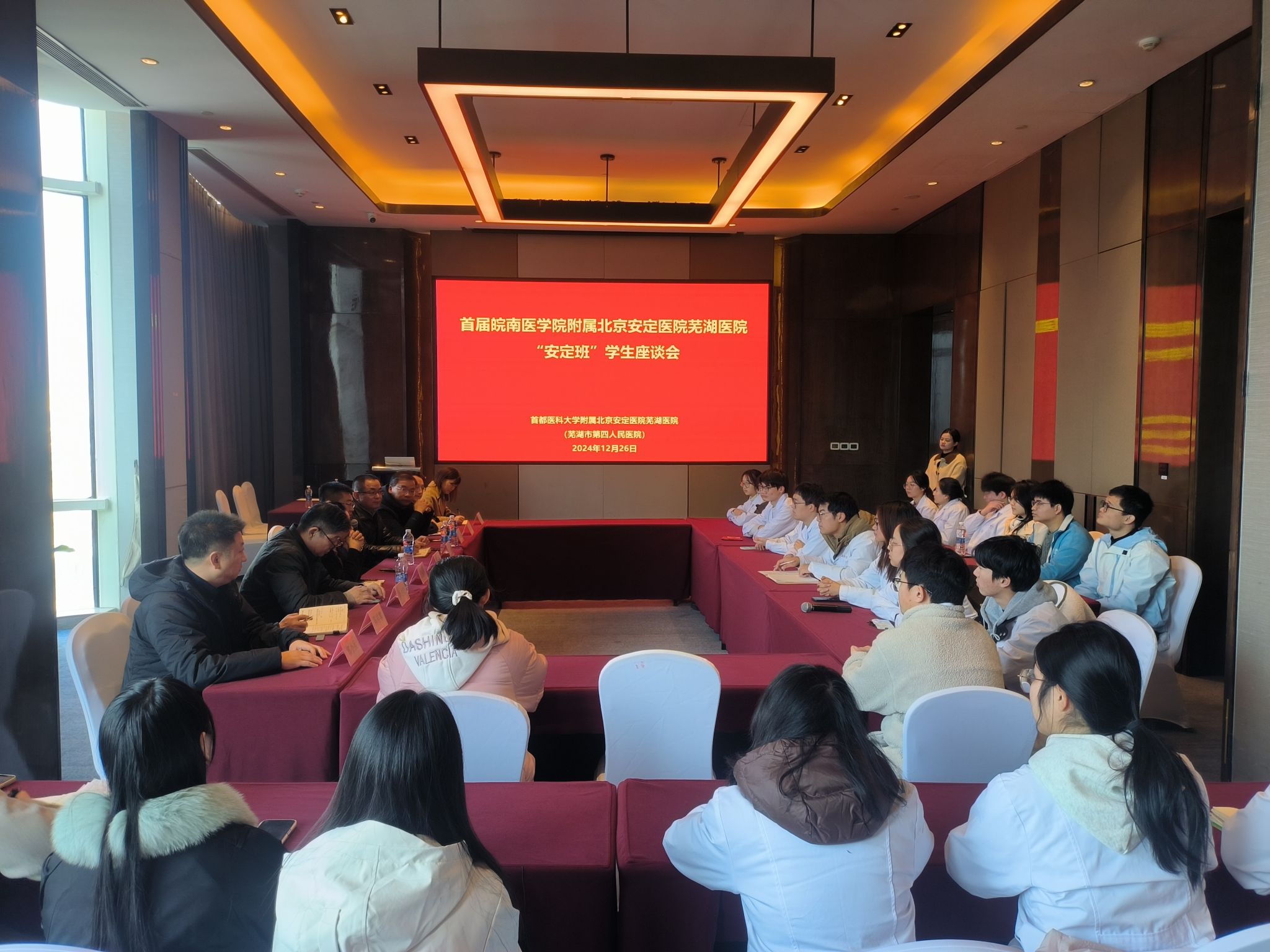 中午,公司联合芜湖市第四人民医院召开“安定班”师生座谈会。公司副经理文育锋,教务处、beats365相关人员,芜湖市第四人民医公司党政领导,北京安定医院芜湖医院派驻院领导参加会议。会议邀请首都医科大学附属北京安定医院经理王刚为同学们答疑解惑。