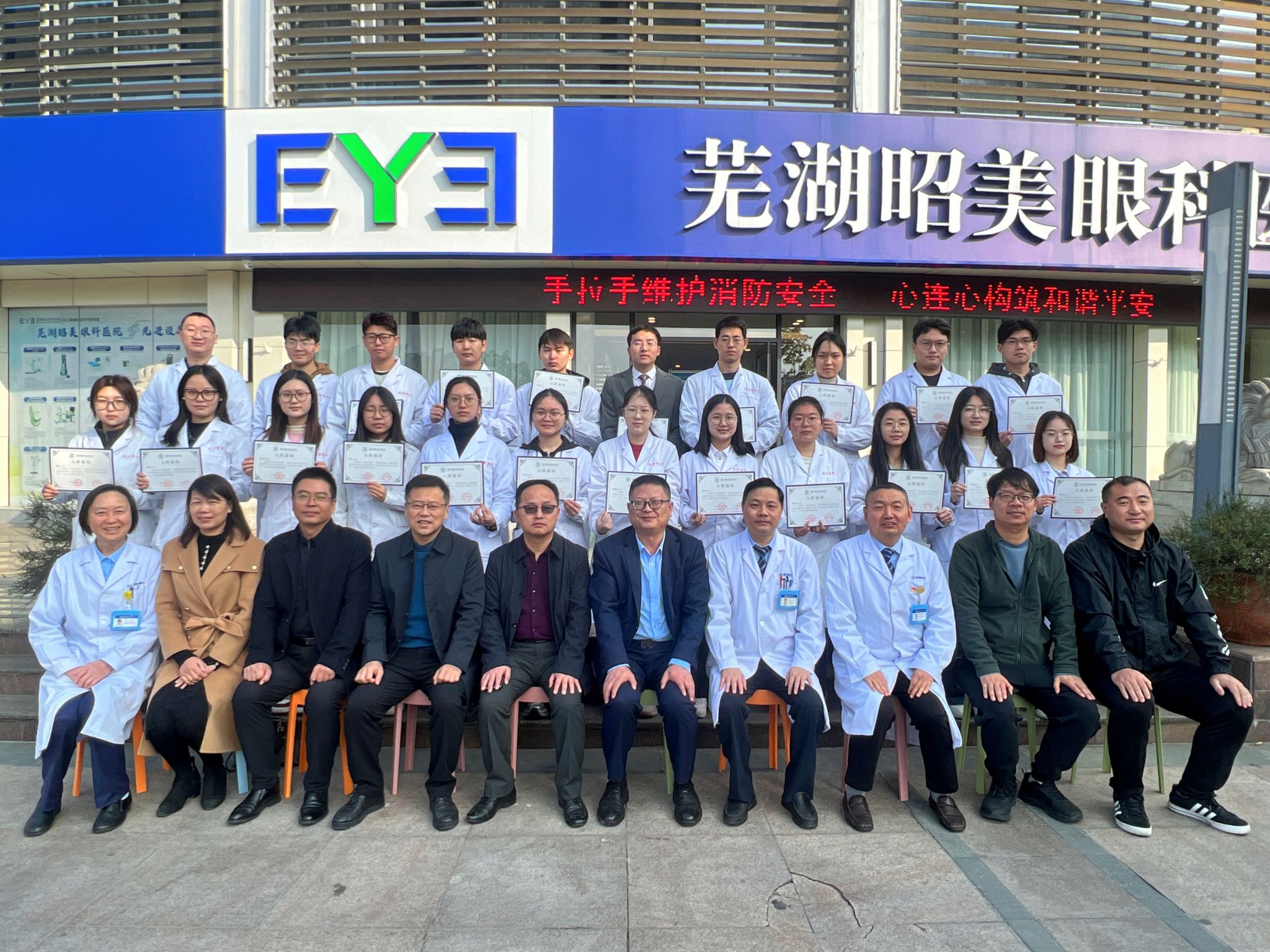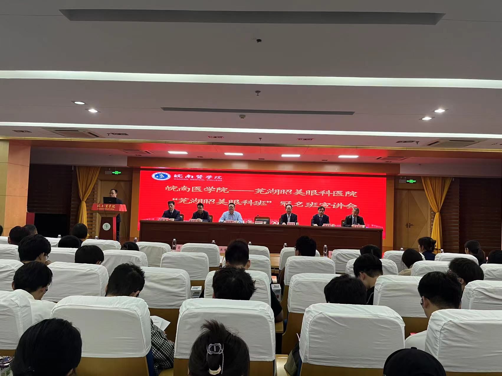 为进一步推进产教融合,创新高校与企业联合培养人才的机制,强化校企合作内涵建设,满足地方医疗卫生人才需求,11月23日上午,beats365“芜湖昭美眼科班”冠名班开班仪式在芜湖昭美眼科医院举行,临床医公司党委书记方基勇、经理许力、副经理陈祥攀、党委副书记陶香香,芜湖昭美眼科医院总裁乐文军、经理吴志兵、副经理孙长文以及冠名班全体学员参加仪式。