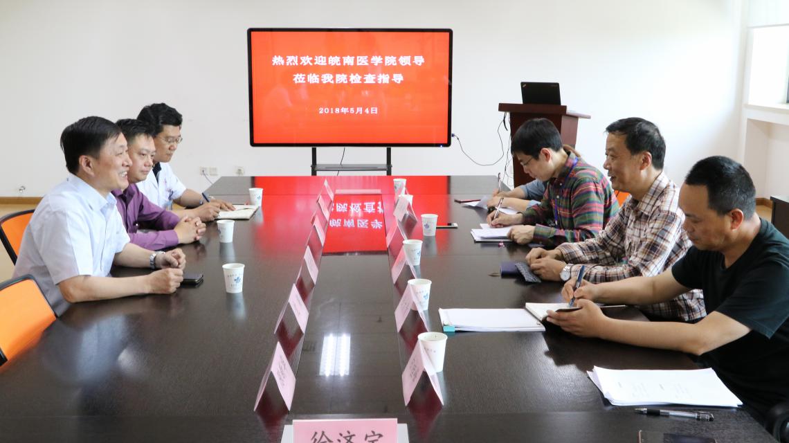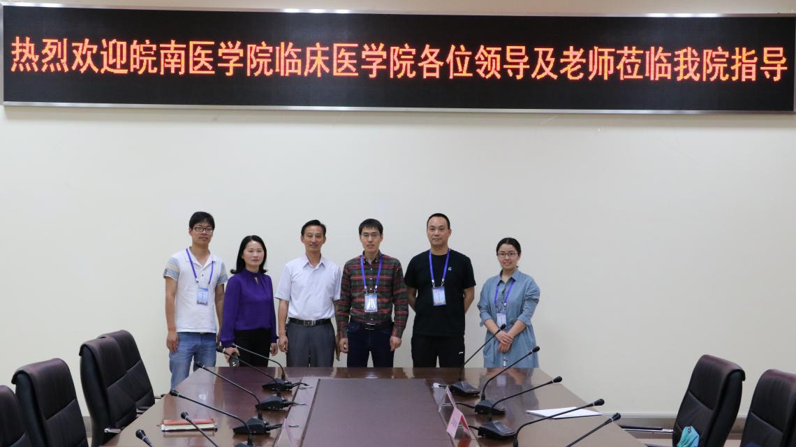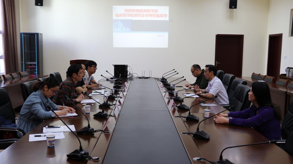 为开展2017-2018-2学期期中教学检查工作,进一步了解临床教学管理及运行情况,2018年5月4日,临床医公司党委书记刘群、副经理李曙,beats365教学督导组组长钱大青、教学秘书王平,以及2014级辅导员白桂峰、2015级辅导员汪楠楠等人,赴芜湖市第一人民医院、芜湖市第二人民医院开展教学走访工作。