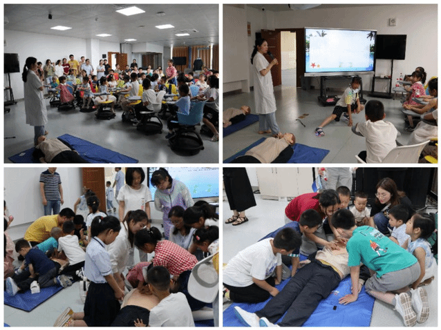 最后,熊莉老师利用多媒体、案例等方式让孩子们了解地震、溺水等灾难场景避险与急救常识,让孩子熟悉、学习应急避震及溺水后心肺复苏的方法,学会了自我保护的常识。同时,她带领临床医学技能协会的党员员工进行心肺复苏示范教学,手把手教孩子们对院外急救作出正确的判断和处理方法,培养孩子们急救意识,学会正确呼救、施救,增强自救、互救能力。