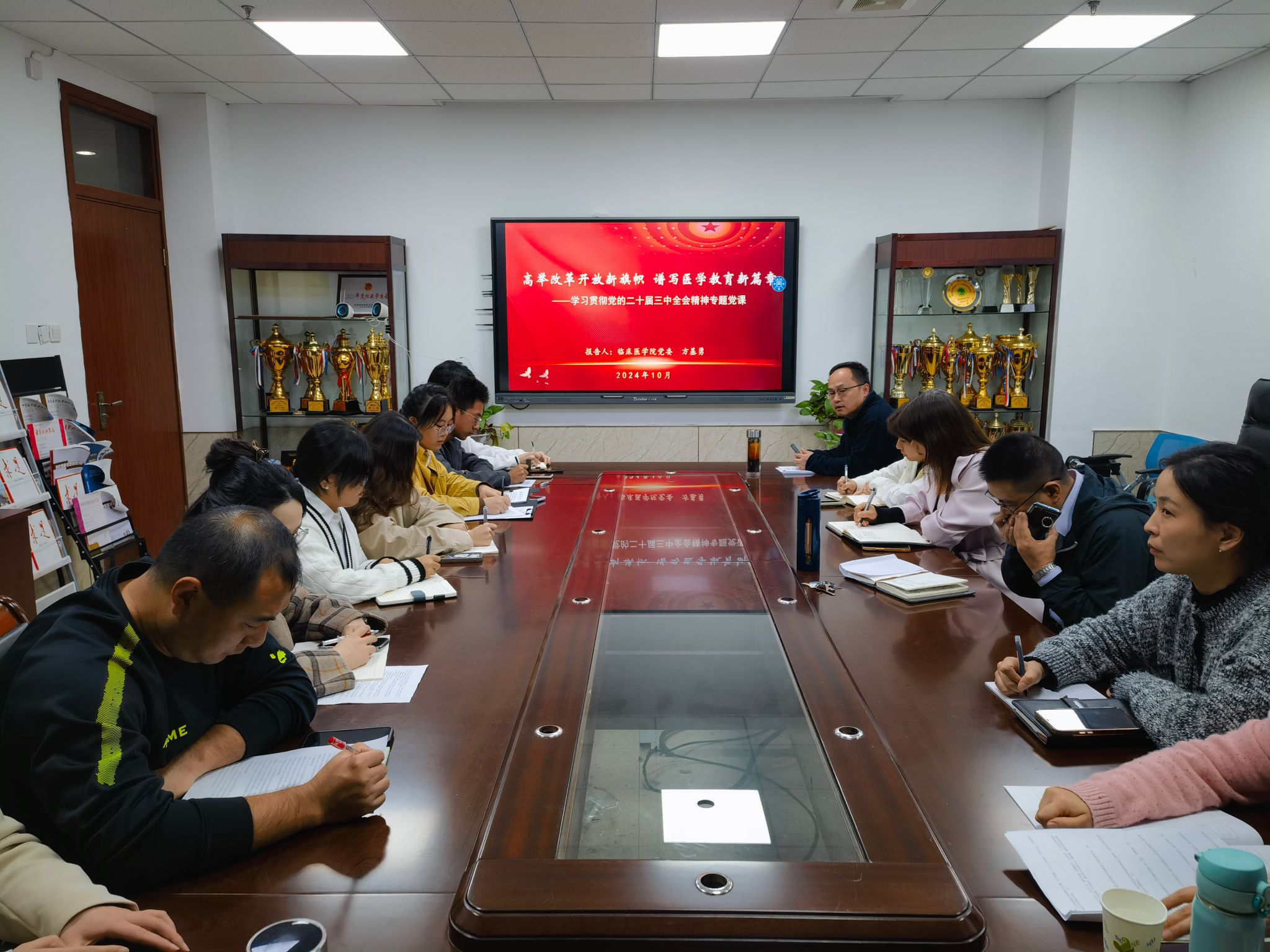 一堂主题党课。方基勇作题为《高举改革开放新旗帜 谱写医学教育新篇章》的专题党课,阐释了党的二十届三中全会的重大意义和主题。他围绕“为何改、向哪改、怎么改”三个方面,深入解读全面深化改革在推进中国式现代化发展中的重要作用,并结合如何推进公司事业发展进行了讲解分析。