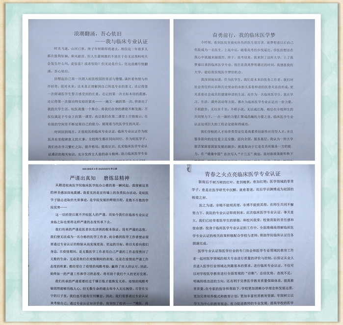为引导员工全面准确理解临床医学专业认证的相关政策,beats365团委开展了“笔述心声之我与临床专业认证”主题征文活动。活动秉持“多方面,全覆盖”的原则,通过前期线上线下的宣传,同学们踊跃参与投稿,活动共收到作品六十余篇。同学们用朴实无华的文字将自己对专业认证的认识书写成稿,内容紧扣主题,条理清晰,最终,2018级刘文静同学的作品《奋勇前行,我的临床医学梦》获得一等奖,2019级徐欣然等同学的作品《浪潮翻涌,吾心依旧--我与临床专业认证》获得二等奖,2020级林云康等同学的作品《严谨出真知,磨炼显精神》获得三等奖。