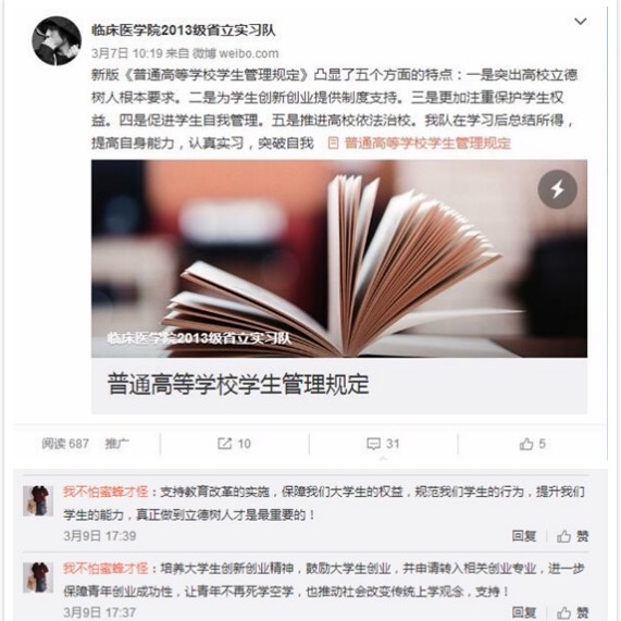 beats365注重方式创新,线上线下相结合。针对同学们在调研过程中普遍反映的关注热点,不仅运用传统方式,线下开展主题班会等,还通过公司团委微信公众号,推送分享相关话题文章,进一步帮助同学们解答困惑。同时,实习年级员工还借助微博平台,交流各自学习教育部41号令的心得体会,打破了时间和地域的限制,达到了交流共享的效果。