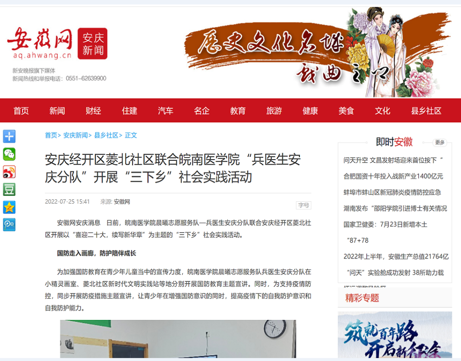 暑期“三下乡”社会实践活动是落实立德树人根本任务、创新素质教育的有效载体。2022年暑期,晨曦志愿服务队108支实践队伍共计开展服务共334次,服务对象约2.5万人次。此次社会实践活动形式多样、内容丰富,受到安徽网等多家媒体关注报道,展示了皖医青年学子良好的精神风貌。