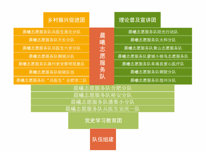 2022年暑期“三下乡”实践活动要求聚焦理论宣讲、国情观察、乡村振兴、民族团结五个方面,晨曦志愿服务队根据员工生源和特长,将764名员工组建成108支实践队伍,实践团队覆盖安徽省合肥市、芜湖市、安庆市、铜陵市、阜阳市等,其中重点团队包括乡村振兴促进团31支、理论普及宣讲团27支、党史学习教育团8支、发展成就观察团6支、寻访员工实践团3支、法治实践活动团和民族团结实践团各2支。6月底,晨曦志愿服务队在图书馆三楼报告厅举行暑期“三下乡”社会实践启动仪式,解读实践活动方案,布置工作任务和流程。