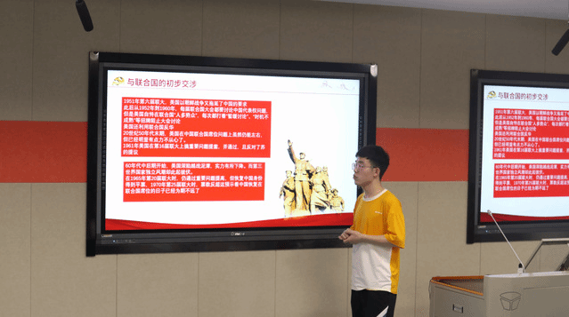 随后,员工党员周海亮结合视频,讲解了“外交风云之中国成功加入联合国”的历史故事,再现了中华人民共和国一次又一次申请恢复在联合国合法席位的艰难过程和第26届联合国大会上成功加入联合国的精彩瞬间,周海亮同学用生动的语言向大家讲述了重返联合国之路的不易,勉励大家“吾辈当自强”。