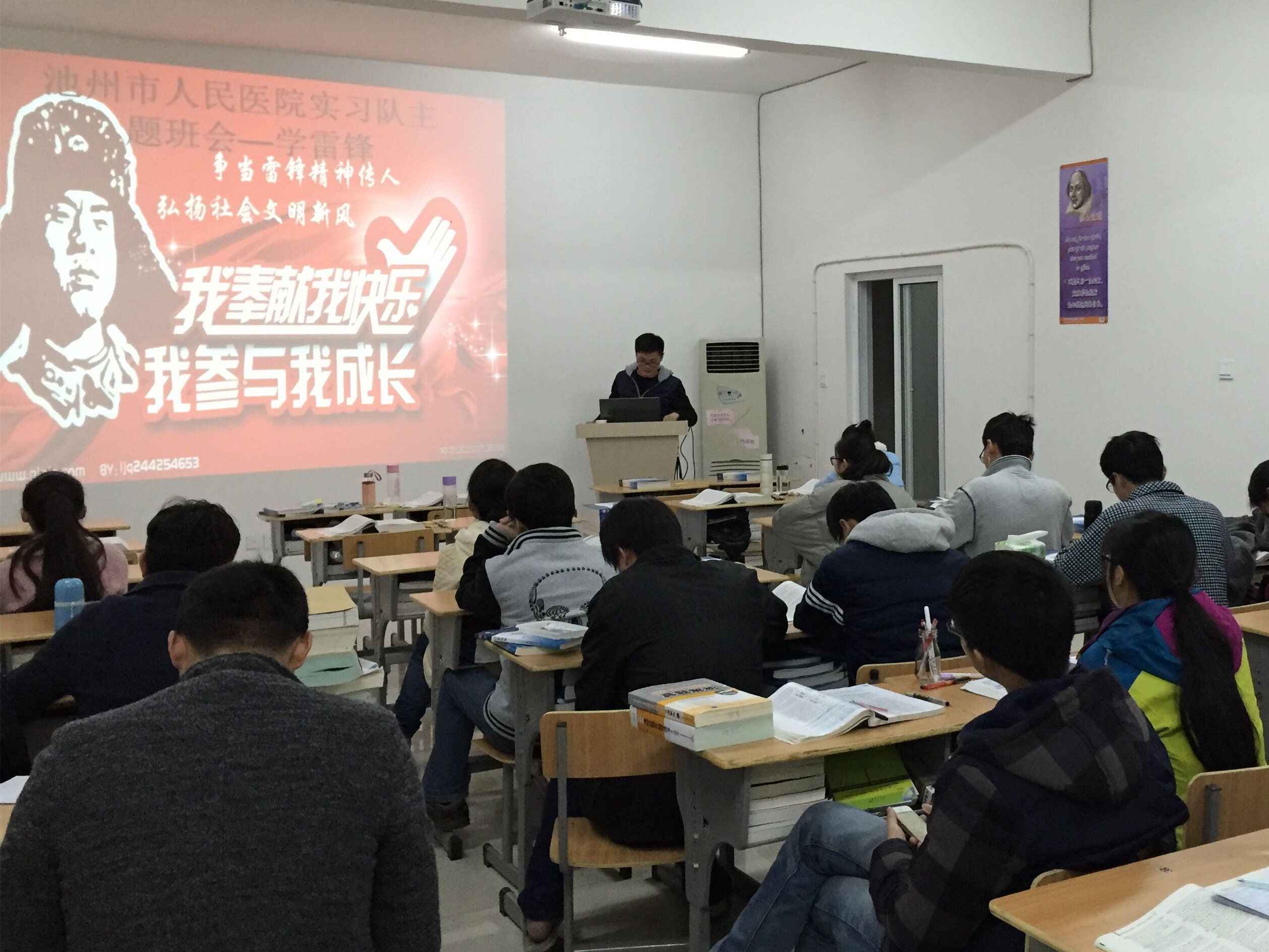 雷锋精神是中华民族宝贵的精神财富,五十多年来,它哺育和激励了一代又一代的青年人。为了让同学们对雷锋精神有更深层次的理解和认识,3月2日晚,池州市人民医院实习队全体成员在自习教室召开了“争当雷锋精神传人,弘扬社会文明新风”主题班会。会上,同学们首先观看了一段关于雷锋同志先进事迹的学习视频。紧接着,队长又为大家介绍了几位现代“活雷锋”的感人事迹。最后,与会同学围绕“医员工如何发扬雷锋精神”这一话题踊跃发言,纷纷表达了自己向雷锋同志看齐的决心。