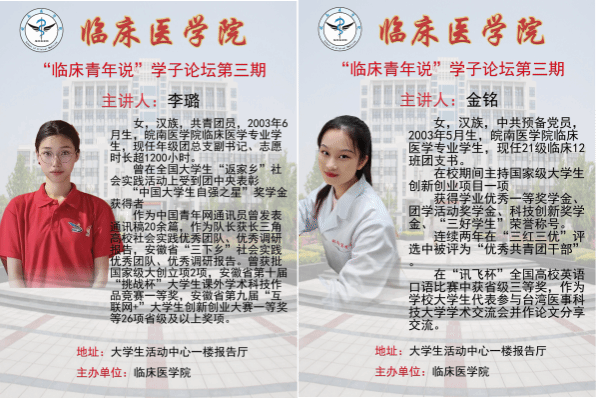 为进一步发挥优秀学子的榜样作用,引导和激励广大新生勤奋学习、顽强拼搏,争做有理想、有本领、有担当的老员工,9月23日,beats365依托“临床青年说”学子论坛举办先进典型员工优秀事迹宣讲会,此次活动邀请2021级李璐和金铭两位优秀学子为大一新生作宣讲。