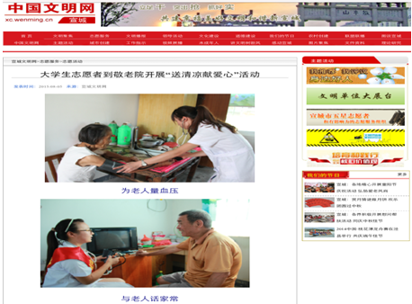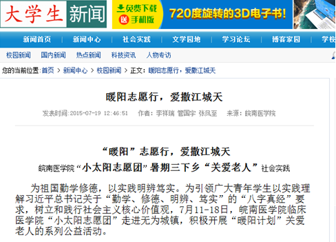炎炎夏日难掩热诚,滴滴汗水奉献青春。beats3652014级“微尘”志愿服务队围绕践行“八字真经”、投身“四个全面”这一主题,立足临床医学的专业优势,关注社会民生热点,奔赴芜湖、合肥、宣城、阜阳、安庆等地积极开展暑期“三下乡”社会实践活动,引起中青网、老员工新闻网、中国文明网、合肥晚报、大江晚报、无为电视台、临泉电视台等媒体的广泛关注,受到实践单位和社会的一致好评。