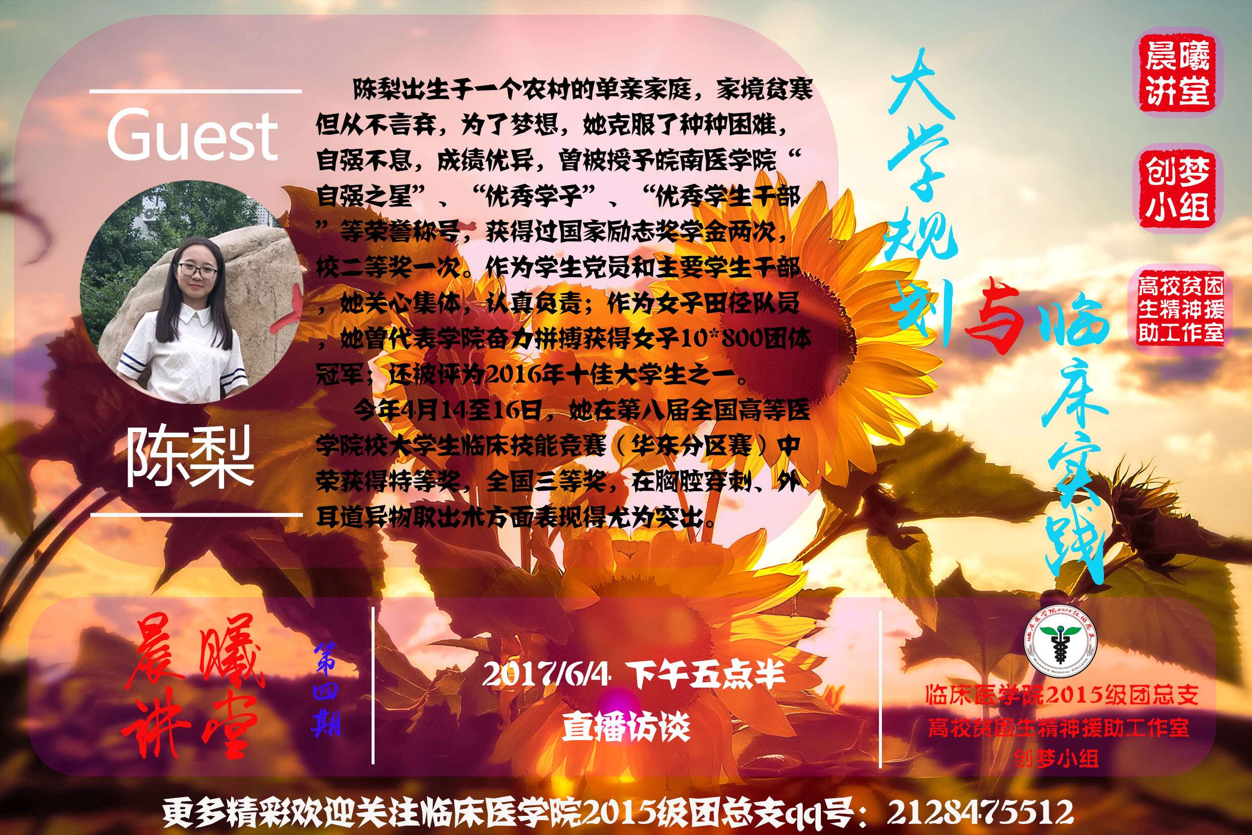 作为励志学子的优秀典型,生活的重压并没有击垮陈梨,在临床医学的学习道路上她奋勇前行,开出了属于自己的向阳花。陈梨回忆了五年皖医生活中的点滴,向同学们讲述了自己拼搏进取、不言放弃的大学故事,重点向学弟学妹们介绍了自己参加临床技能大赛的经历与收获,鼓励同学们不畏困难、做更好地自己,并向五年来培养她的公司、老师们表达了深深地感激之情。访谈现场气氛活跃融洽,陈梨同学深入浅出地解答了同学们关心的临床专业学习、技能大赛等问题,为同学们有关学习生活、班级工作和就业考研等方面的困惑提供意见和建议,线上观众也通过主持人参与到互动的环节当中。