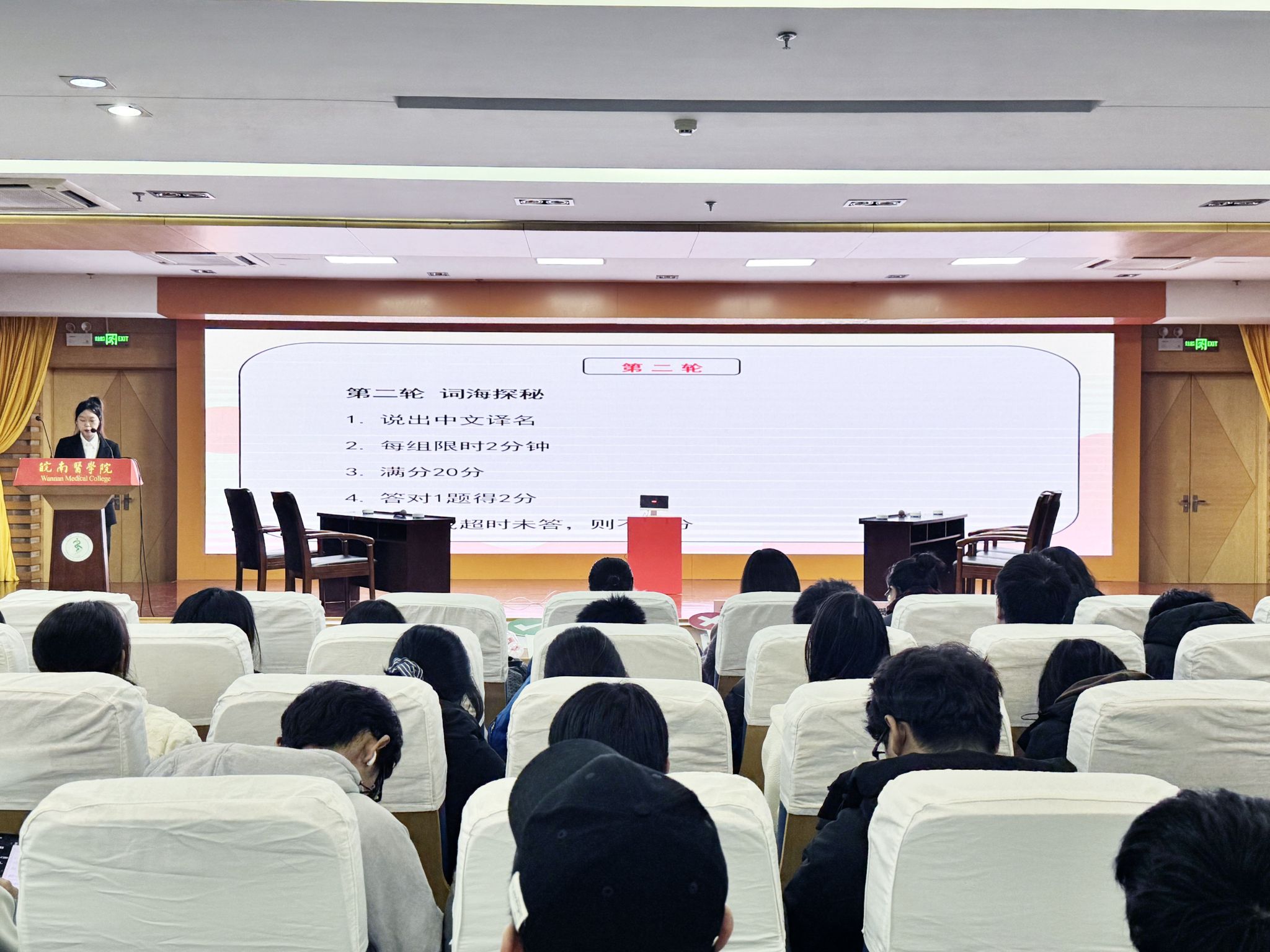 决赛采用积分制,分为“词力风暴”“词海探秘”“词宫迷云”“华山论词”四个环节,难度不断增加。“词力风暴”着重考察选手对单个词语拼写、发音的掌握;“词海探秘”与专业英语结合,侧重考察选手对医学英语的掌握情况;“词宫迷云”不仅考察选手对英语语言的熟悉程度,也考察对文化背景的掌握情况;“华山论词”环节请选手随机抽题,围绕“感恩”“节俭”“自律”“谦虚”“责任感”等主题进行90秒主题陈述,对选手的应变能力、文化素养提出了更高要求。比赛过程中,选手们灵活应变、巧妙答题,沉着冷静、字正腔圆,一字一句尽显扎实功底和青春风采,现场气氛热烈,精彩纷呈。