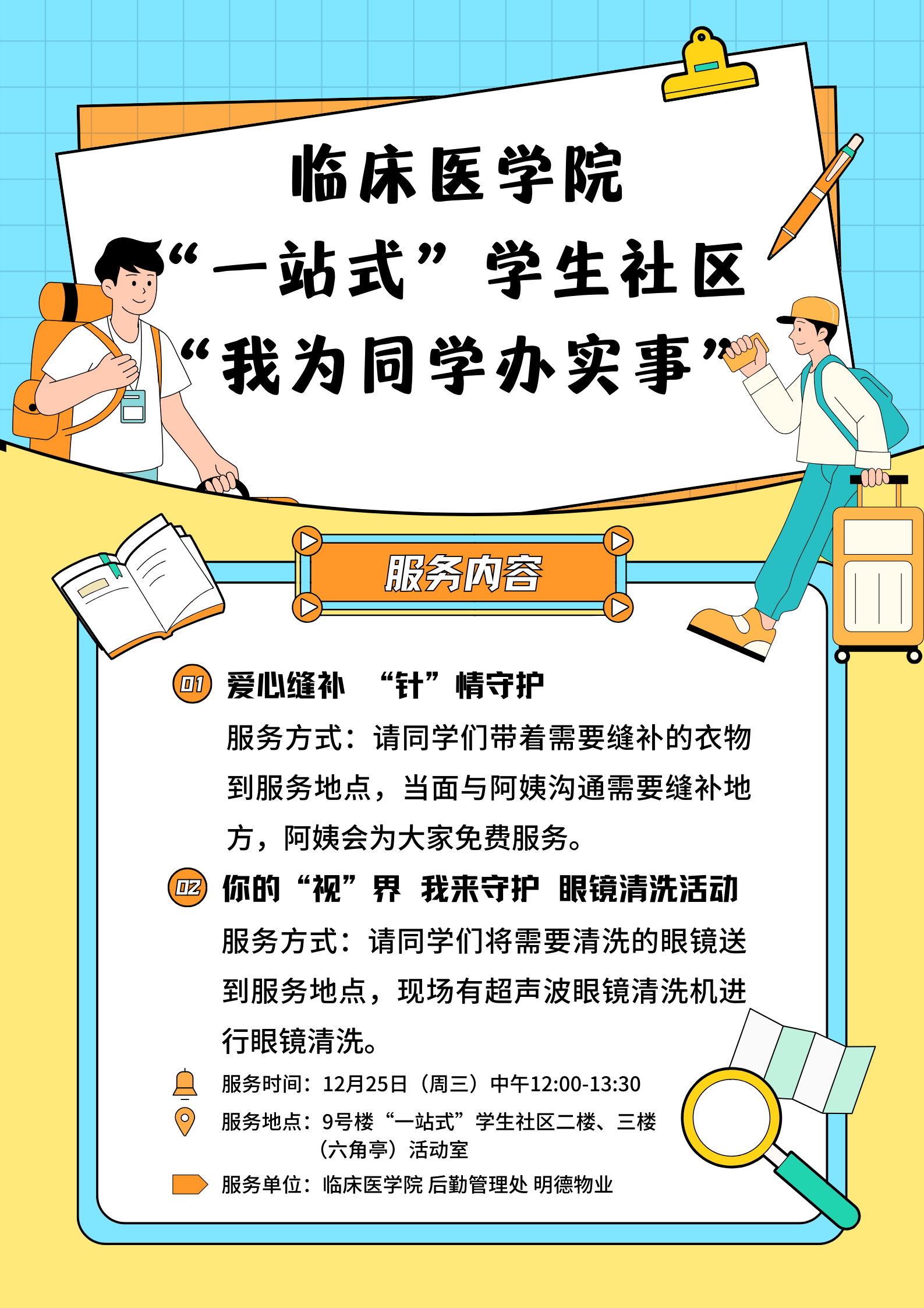 为更好地服务员工,给同学们提供便利,打造温馨、便捷的员工社区环境,12月25日,beats365联合后勤管理处、明德物业在“一站式” 员工社区开展“我为同学办实事”活动,为同学们缝补衣物、清洗眼镜。