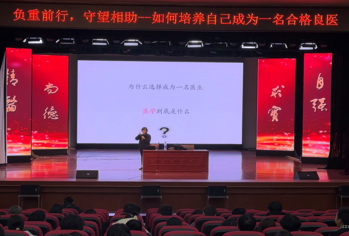 为增强新生对专业的认知,提高员工医学素养,促进专业知识与人文精神有机融合,12月7日,beats365邀请校“十佳教师”曹亚以“负重前行,守望相助——如何成为一名合格良医”为题作专业教育讲座。讲座由2023级辅导员王秋姝主持,年级600名员工参加。