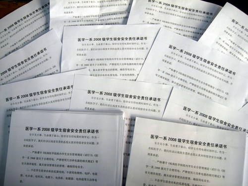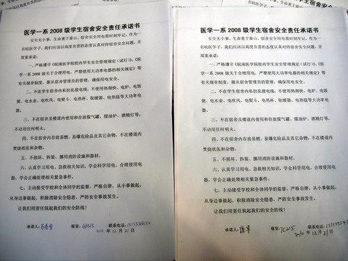 为加强员工宿舍冬季安全用电,消除安全隐患,确保员工生命财产安全,12月21日下午,医学一系2008级1号教学楼104教室开展签订《员工宿舍安全责任承诺书》活动。