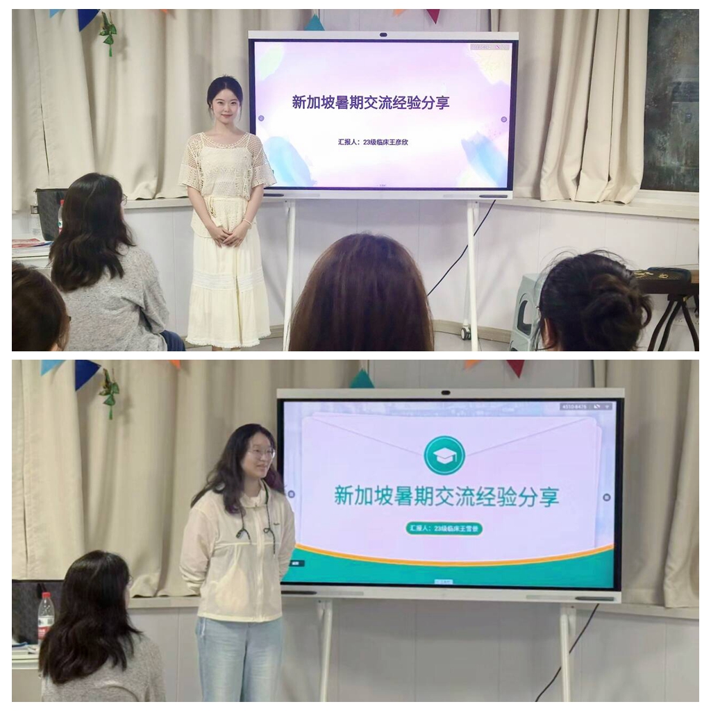 交流会上,2023级王雪景、王彦欣同学分享了暑期赴新加坡国立大学参与特色课程和团队合作完成项目的经历,以及当地多元的饮食文化带来的思考,表示通过团队合作交流锻炼了自身学术思维与协作能力,拓宽了国际视野,对未来的医学之路与个人发展有了更清晰的规划。