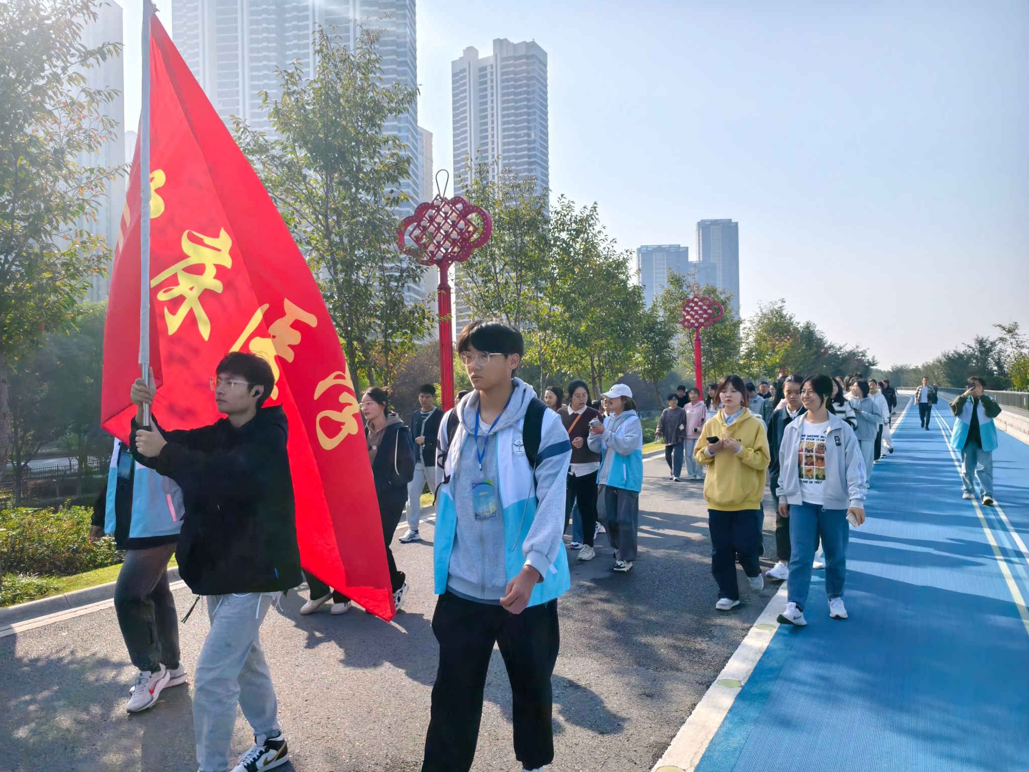 积跬步,致千里;扬青春,磨意志。在十里江湾公园,伴随着前进的号角,同学们凝心聚力,携手向接力点进发。大三年级的队伍率先完成第一段接力,将旗帜传递给大二年级。一棒接一棒,经过所有人共同的努力,大一年级的队伍也顺利完成了最后一个目标,同学们接力完成的三段路程共计7.5公里。步行过程中,同学们高涨的热情感染了江湾社区的民众,他们也加入到同学们的队伍当中与大家一起捐步。