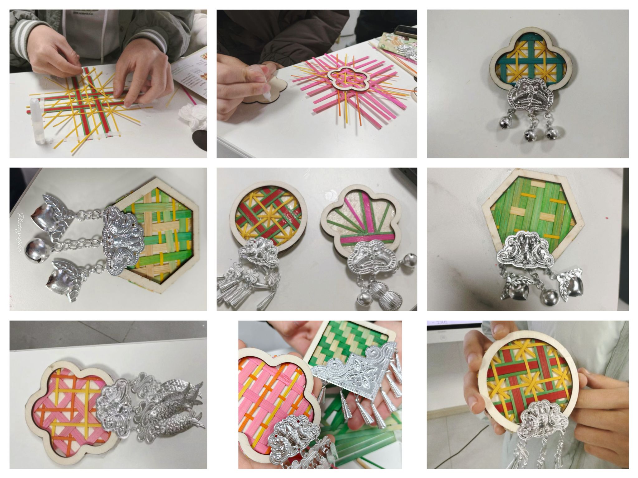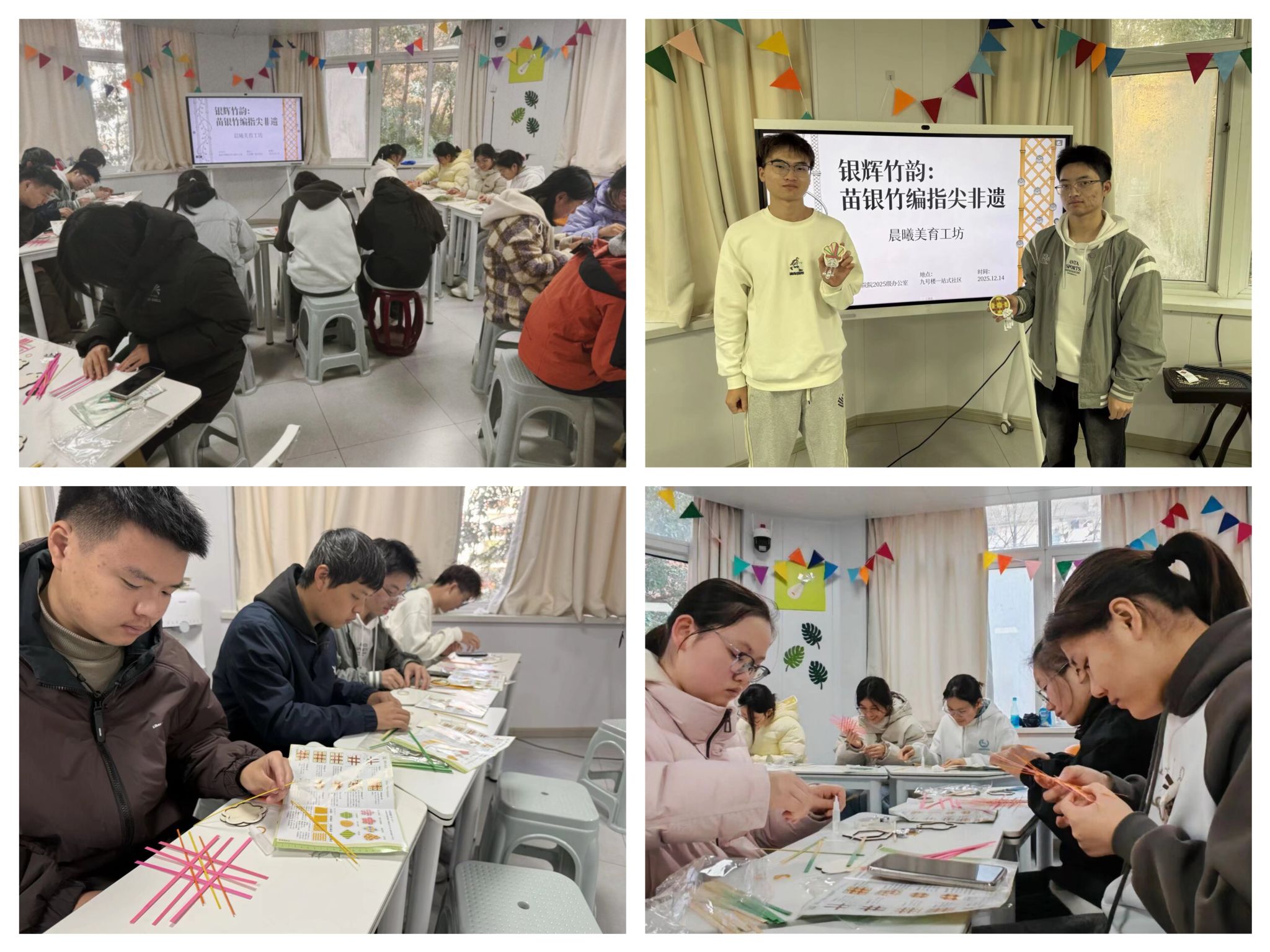银辉竹韵·融合创作。第二场“银辉竹韵:苗银竹编冰箱贴”活动,创新性融合苗银与竹编两大非遗元素。活动伊始,非遗文化宣讲同学详细介绍了苗银的纹样寓意和竹编的历史传承,随后指导大家开展手工制作。同学们在编织竹胎、镶嵌银饰的过程中,不仅掌握了实用的手工技能,更体会到非遗技艺跨界融合的创意之美,制作出兼具装饰性与实用性的冰箱贴作品。