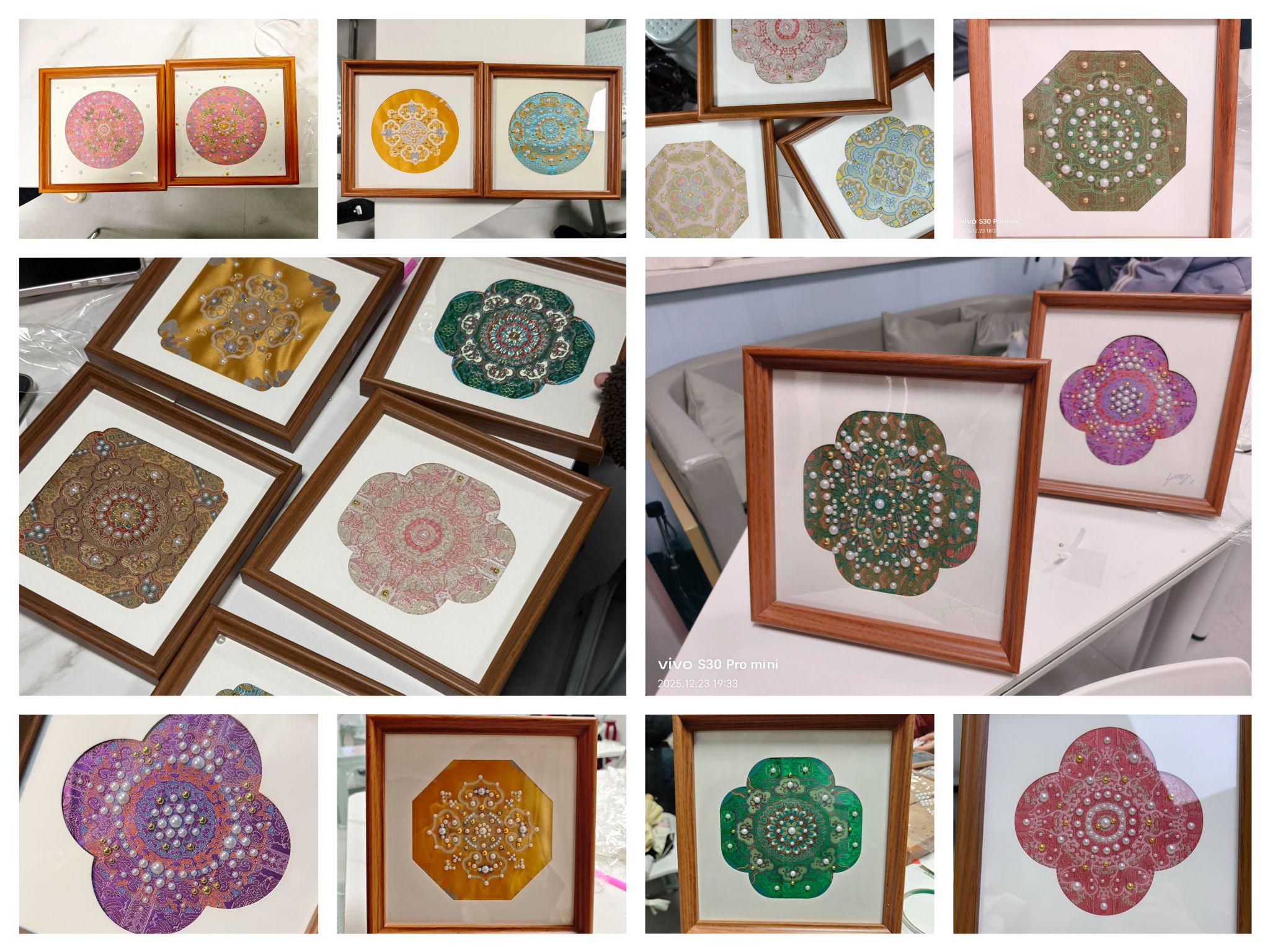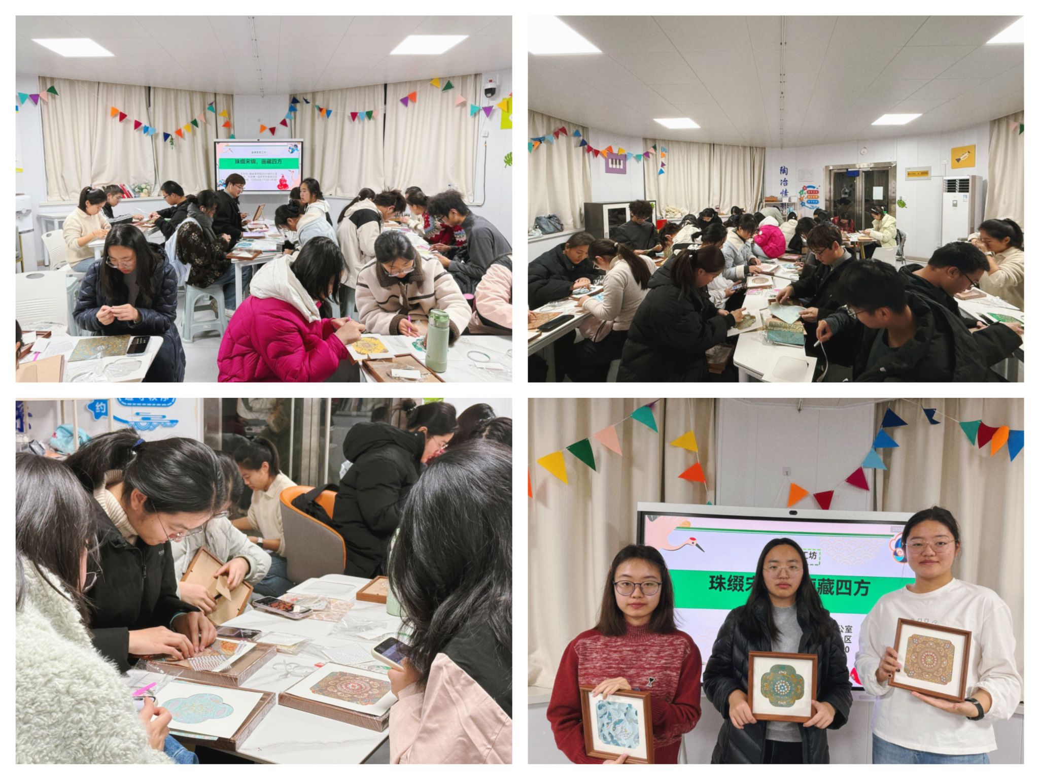 珠缀宋锦·创意制作。第三场“珠缀宋锦,画藏东方”活动聚焦宋锦这一珍贵非遗技艺。非遗文化宣讲同学先系统讲解宋锦的历史文化价值与纹样特点,再带领大家进行手工创作。同学们运用串珠工艺点缀宋锦面料,将传统锦缎的典雅与珠饰的璀璨相结合,制作出蕴含东方美学的装饰画。活动现场,大家细致勾勒、精心点缀,在慢工细作中感悟宋锦的华贵与温婉。