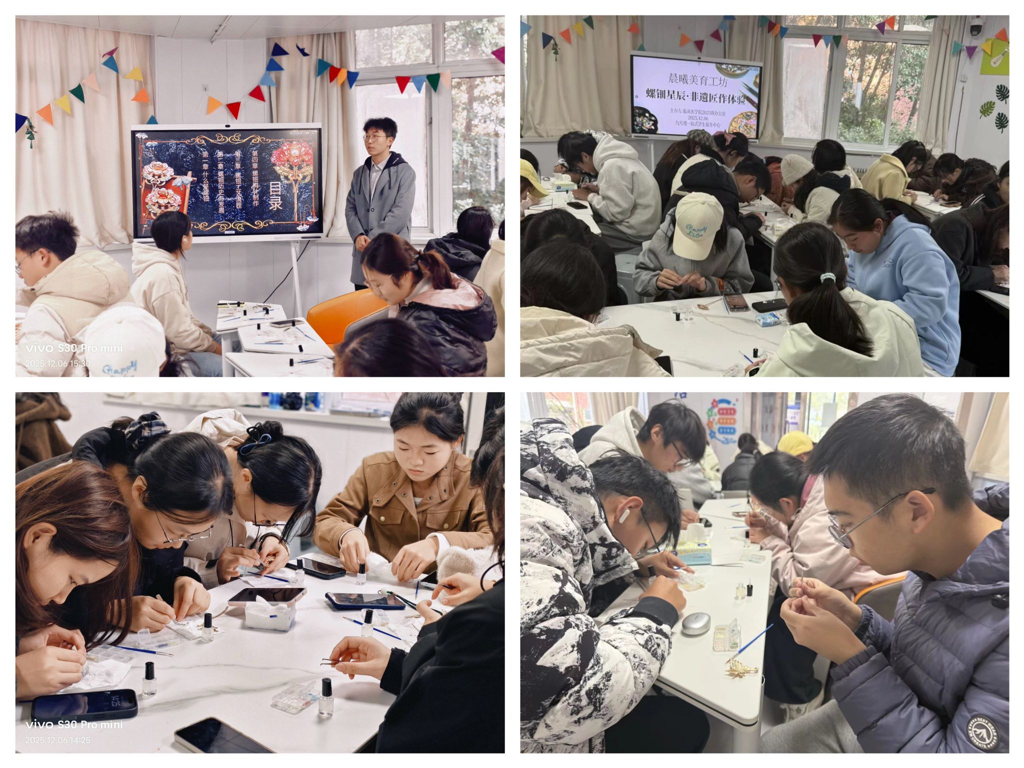 螺钿星尘·匠作体验 。活动首场以“螺钿星尘·非遗匠作体验”拉开帷幕。活动中,非遗文化宣讲同学率先分享螺钿工艺的历史渊源与文化内涵,随后带领大家实践制作,将细碎贝壳转化为带有星光质感的精美饰品,沉浸式感受传统工艺的精巧与灵动。