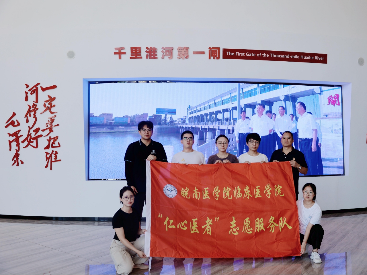 活动期间,两支团队还沿着习近平总书记的足迹,走进王家坝抗洪纪念馆与王家坝闸,深刻感悟王家坝精神。馆内,一幅幅震撼人心的历史图片、一件件浸润水痕的实物展品,无声诉说着阜南人民16次抗洪抢险的壮阔史诗。“2020年洪水来袭时,村民连夜转移,却把粮仓腾空装沙袋固堤。”讲解员动情讲述了“舍小家,为大家”的王家坝精神。站在雄伟的王家坝闸上,同学们纷纷表示,要将这种伟大的王家坝精神融入到今后的学习和生活中,勇担时代使命,为实现中华民族伟大复兴贡献青春力量。