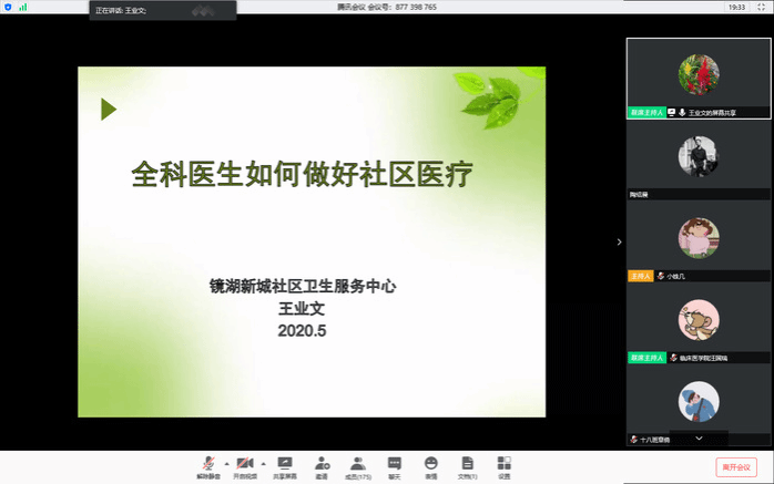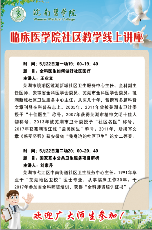 为加强员工对社区医学知识和社区卫生工作的了解,5月22日晚,beats365邀请镜湖区镜湖新城社区卫生服务中心主任王业文和弋江区中南街道社区卫生服务中心主任刘素芹两位专家作“社区教学”线上讲座。本次讲座由秘书汪国瑞主持,各年级辅导员和全体临床医学免费定向生通过腾讯会议聆听讲座。
