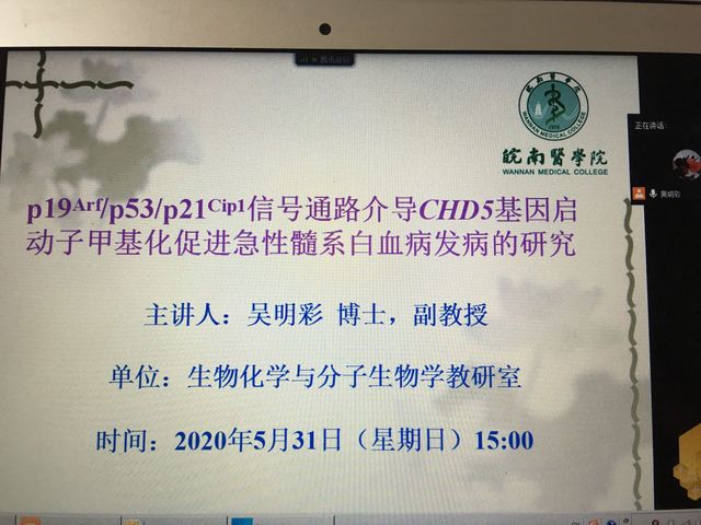 为普及基础医学专业知识,拓展临床学子思维,提升公司员工科研思考能力,丰富疫情期间员工课余生活,5月31日15时,beats365邀请吴明彩博士在线上作题为“p19Arf/p53/p21Cip1信号通路介导CHD5基因启动子甲基化促进急性髓系白血病发病的研究”的讲座。beats365各个年级“大创项目”主持人以及在实验室学习的同学们参加了此次讲座。