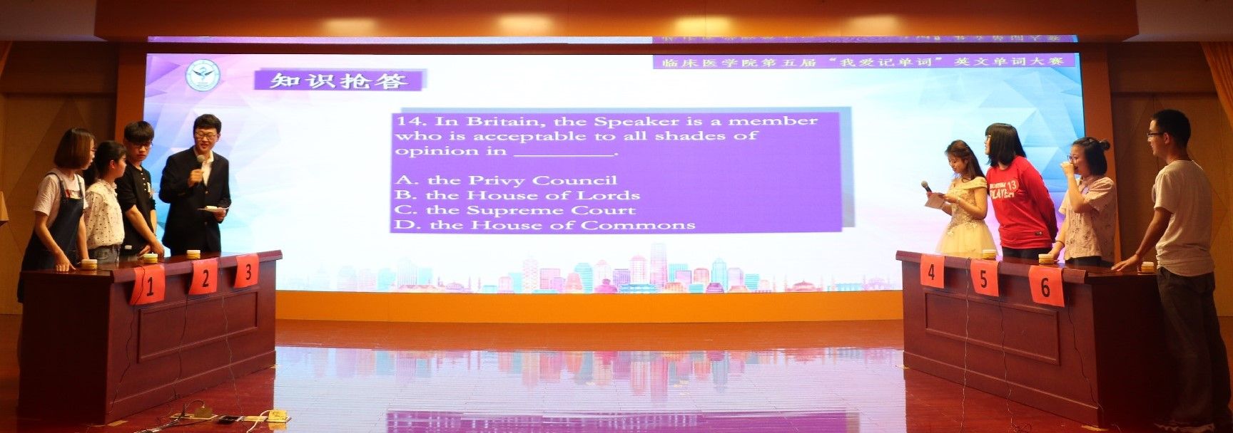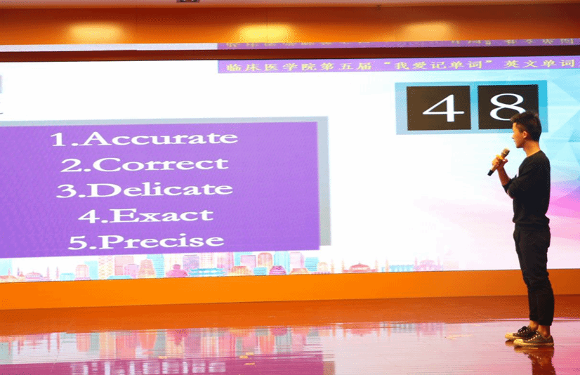 语言魅力共彰显,教无止境同前行。为进一步激发员工英语学习的积极性,提高学习趣味性,推进优良学风建设。4月27日晚,beats365联合高校贫困生精神援助工作室、习近平新时代中国特色社会主义思想青年学习社,在图书馆三楼学术报告厅隆重举办了第五届“我爱记单词”英文单词大赛决赛。大赛邀请公共基础公司外语教研室王翠莲、赵军和李东老师担任评委,外事处处长赵梅、团委副书记余亮等担任指导嘉宾。临床医公司党政领导和各年级辅导员出席比赛现场。比赛采用中英文双语主持,公司各年级近400名同学到场观摩学习。