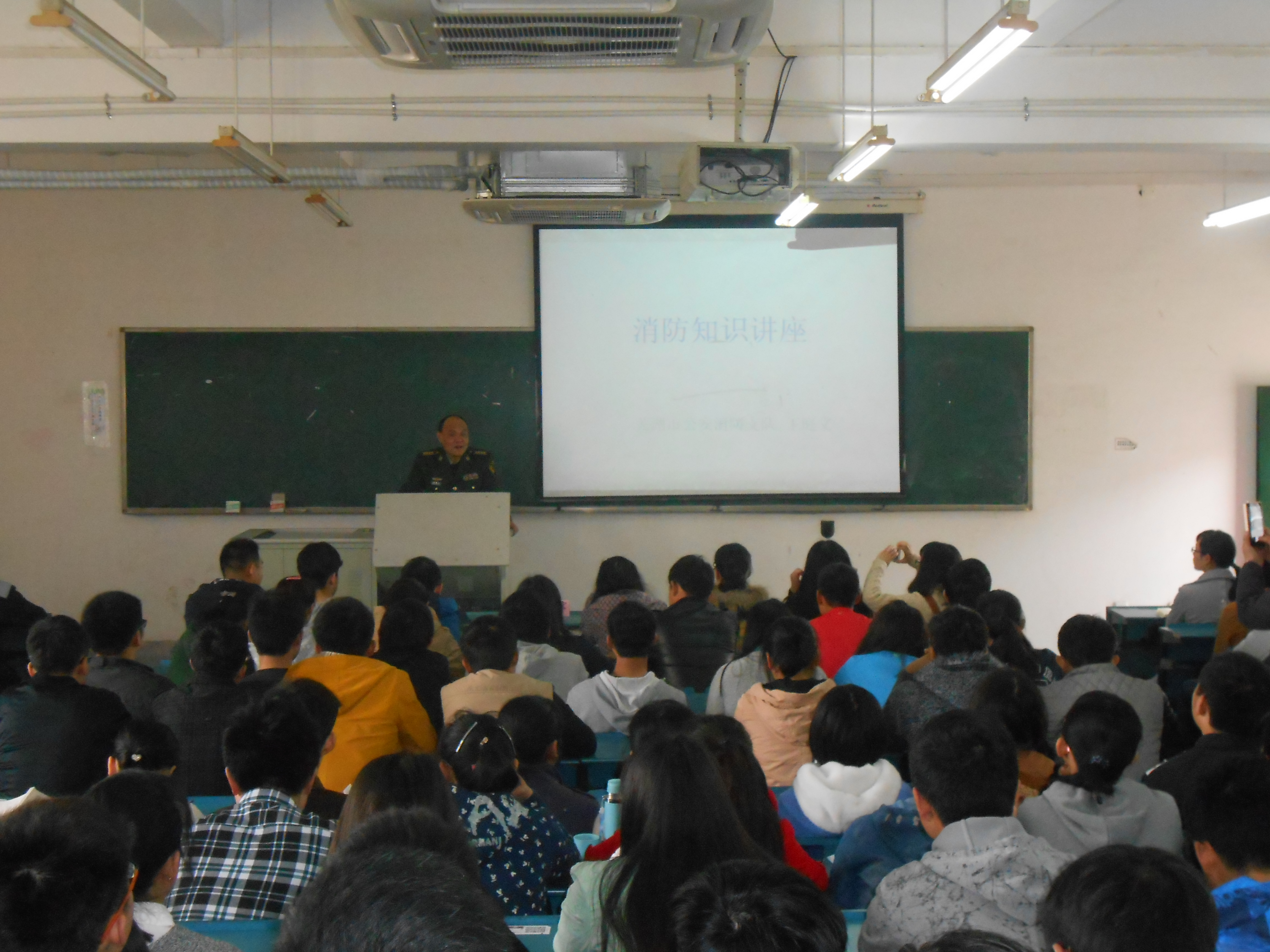 上午10:00在1303教室举办的消防安全知识讲座,拉开了本次专题教育活动的帷幕。讲座特邀芜湖市消防支队王庭文警官主讲,保卫处卢举纲老师主持,2014级各班员工代表全程参与。讲座上,王庭文警官向同学们介绍了全国各地近年来频繁发生的火灾事故,以及带来的巨大的经济损失和严重的人员伤亡。一起起骇人听闻的事件,一张张触目惊心的火灾现场照片,无不给同学们敲响了安全警钟,提醒他们深刻认识到预防火灾的重要性。王警官还结合消防制度和规定,对如何树立消防意识,个人面对突发火灾事故应如何进行救灾及逃生等方面进行了全面讲解。
