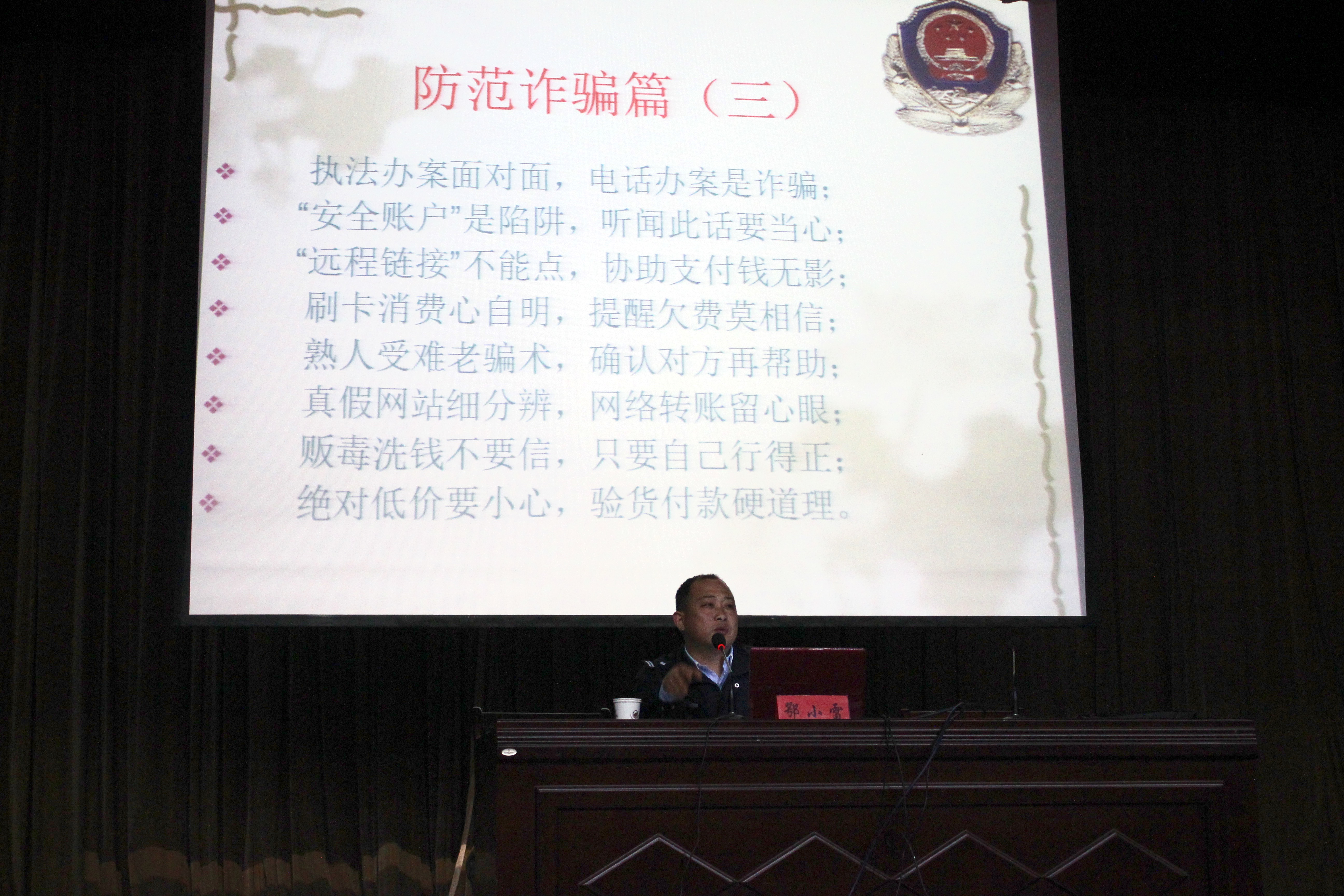 鄂教导员用芜湖市高教园区7所高校近年来真实的案例向同学们介绍了8种常见诈骗形式,分别为:冒充公、检、法诈骗;刷信誉度诈骗;qq盗号诈骗;网上购物诈骗;中奖短信诈骗;银行卡诈骗;冒充淘宝客服诈骗和街头诈骗。针对每个案例鄂教导员都向同学们深入剖析员工受骗的原因、骗子行骗的破绽、以及同学们日后防范的要点。鄂教导员生动诙谐的讲解、与员工积极的互动让现场掌声雷动、高潮迭起。讲座最后,鄂教导员还向给同学们提出了八条预防诈骗的口诀,让同学们受益匪浅。