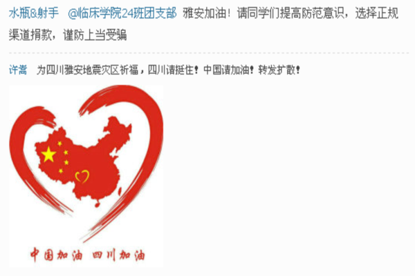 与此同时,同学们在通过正规渠道奉献爱心外,还提醒身边的人不要轻信陌生的捐助方式,以免上当受骗。同学们还积极转发有益于抢险救灾的微博,通过网络传递着正能量。