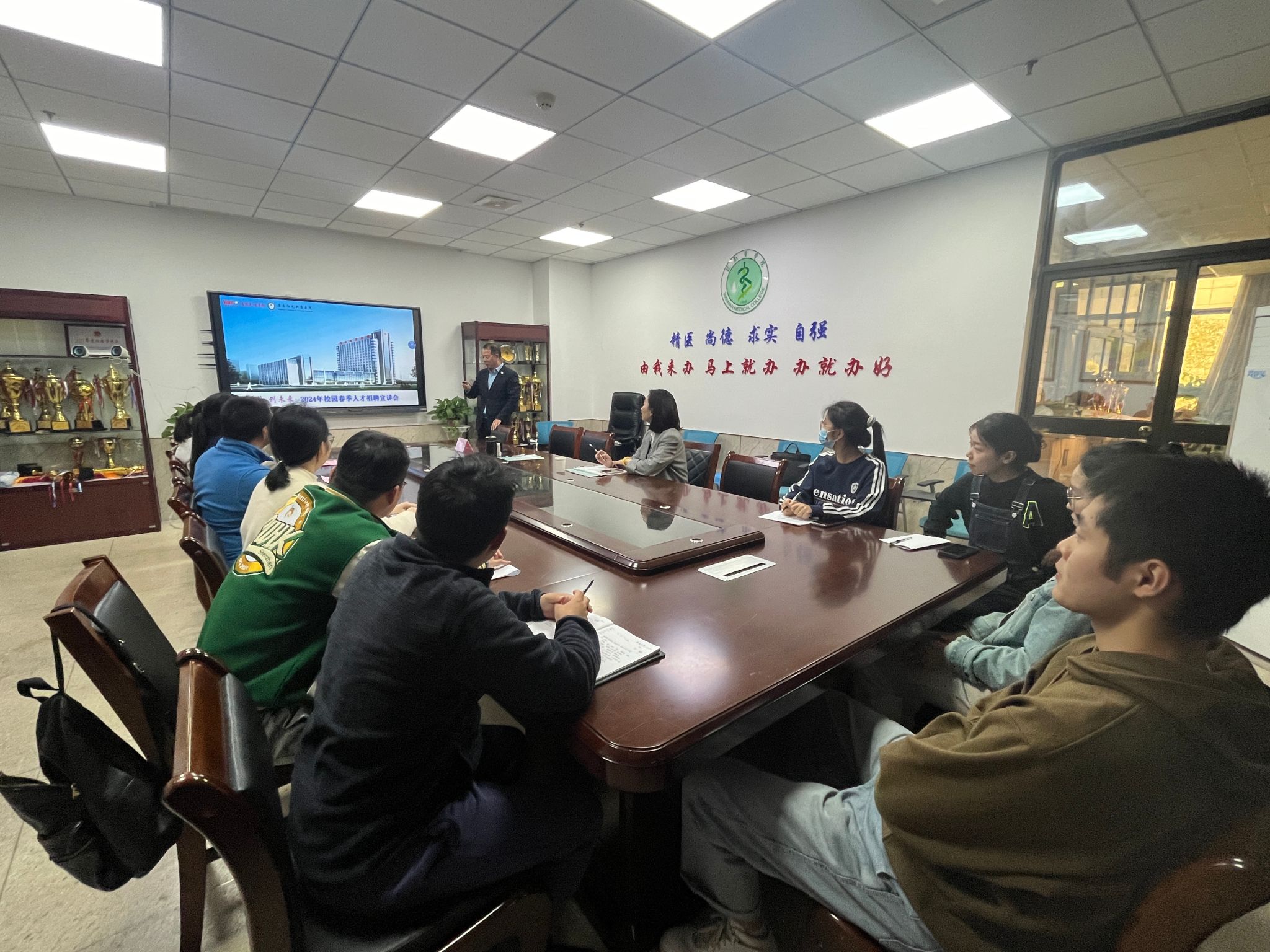 交流会后,淮安八十二医院、淮南阳光新康医院分别开展专场招聘宣讲会,两家医院分别从医院概况、人才培养计划、人员需求等方面进行宣讲,并解答同学们所关心的招聘流程、职业发展、薪资待遇、工作生活环境等问题。宣讲结束后,毕业生结合自身实际积极投递简历。