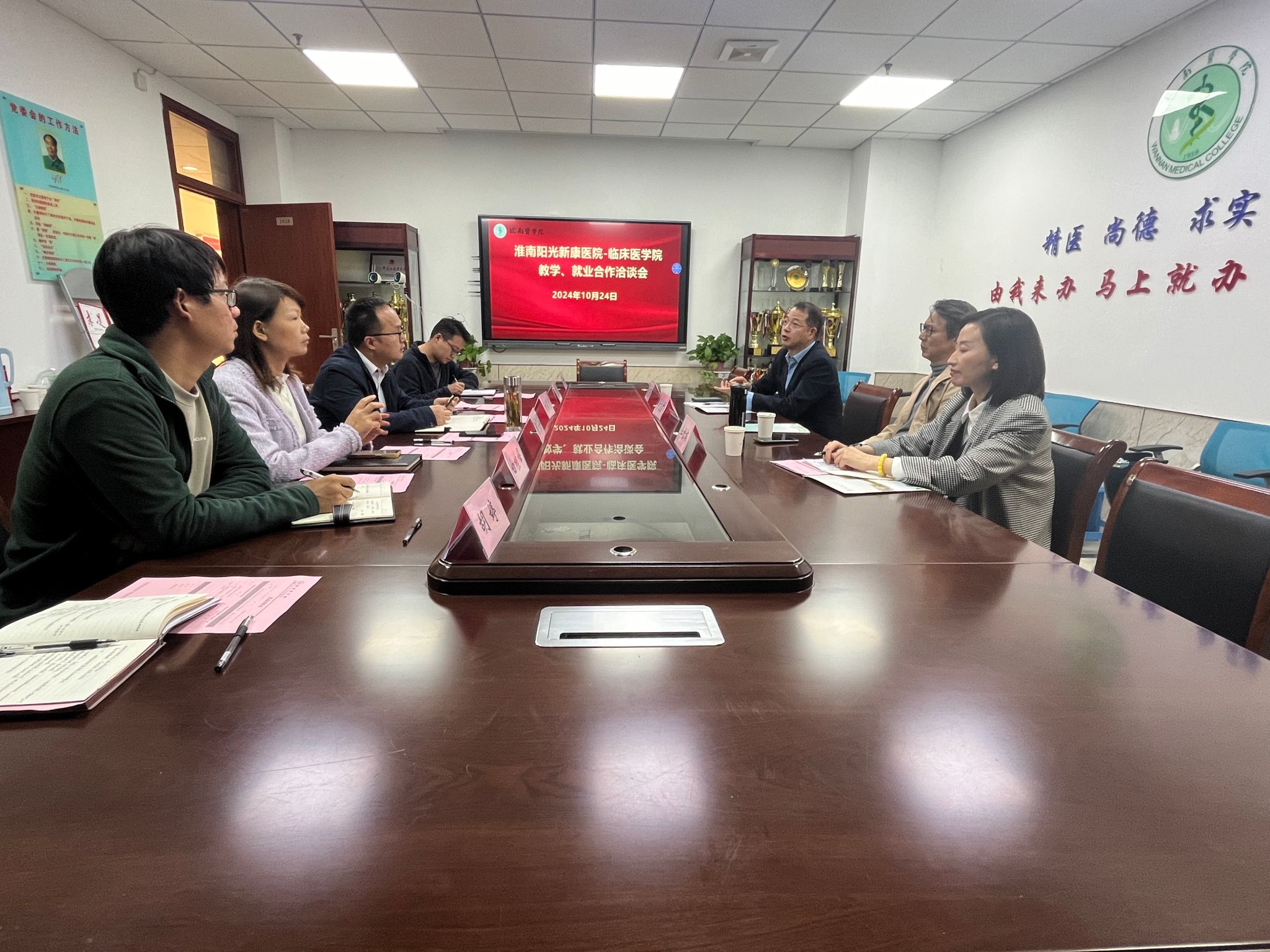 交流会上,方基勇对淮安八十二医公司党委副书记焦峰、淮南阳光新康医院副经理步文广一行的到来表示热烈欢迎,并就beats365基本情况、毕业生整体情况及临床医学专业、康复治疗学专业员工培养情况进行详细介绍。两家医院分别介绍了各自医院发展、科室建设、人才需求及培养等情况,双方围绕员工教学、就业合作等方面进行深入交流。
