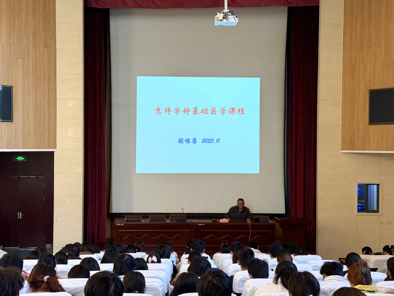 张根葆教授围绕“正确认识和理解医学与医学基础课程”“为什么要学好基础医学课程”以及“怎样学好基础医学课程”等方面展开讲解。他结合自身丰富的教学经验,系统剖析了基础医学的学科定位与课程体系,帮助同学们深化对医学基础课程的理解,同时从学习内容、学习兴趣等角度出发,分析了同学们在现阶段学习过程中可能遇到的困惑,并推荐了多种实用高效的学习方法。此次讲座让同学们进一步认识到医学基础课程的重要性以及学好医学基础课程的方法,为同学们更好地掌握医学基础知识提供了有力支持。